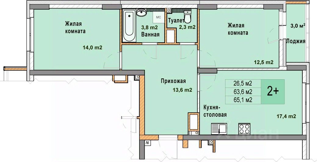Просторная 2-комн. квартира с отделкой в ЖК "Кузнечиха город" на 13 этаже. Общая площадь: 65.1 кв.м. Высота потолков 2.7 м.