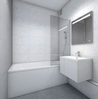 В жилых комнатах, кухне и прихожей — обои нейтрального оттенка, белые межкомнатные двери без стекол. Пол в жилых комнатах — ламинат под дуб, в кухне и прихожей — плитка. Натяжные потолки во всех помещениях. Стены и пол в ванной и санузле будут отделаны керамогранитом, в ванной установлен полный комплект сантехники, включая акриловую ванну с экраном и смесителем, тумбу для хранения под раковиной, зеркало с подсветкой. Застройщик также позаботился и о деталях, поэтому все инженерные коммуникации, стояки водоснабжения и канализации будут скрыты декоративными коробами. #zmeFba