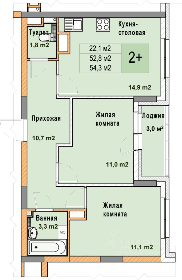 2-комн. квартира с отделкой в ЖК "Кузнечиха город" на 13 этаже. Общая площадь: 54.3 кв.м. Высота потолков 2.7 м.