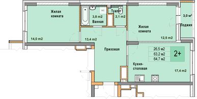 2-комн. квартира от застройщика с отделкой в ЖК "Кузнечиха город" на 23 этаже. Общая площадь: 64.7 кв.м. Высота потолков 2.7 м.