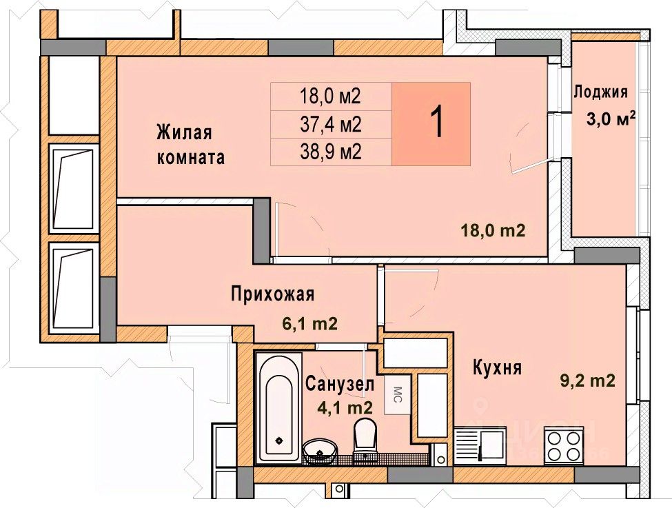 Просторная 1-комн. квартира с отделкой в ЖК "Кузнечиха город" на 24 этаже. Общая площадь: 38.9 кв.м., жилая: 18 кв.м., площадь просторной кухни-столовой: 9.2 кв.м. Все окна выходят на одну сторону. В квартире одна лоджия, один совмещенный санузел. Высота потолков 2.7 м.
