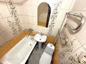 Санузел с отделкой современными материалами приятных светлых оттенков с новой сантехникой и полотенцесушителем.