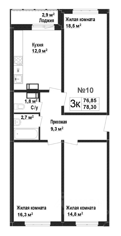 Общая площадь76,85 м²