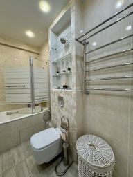 Кухня оборудована встроенной техникой, в санузле установлен бойлер, и помещается постирочная. В прихожей встроенная гардеробная. На этаже есть собственная кладовка.