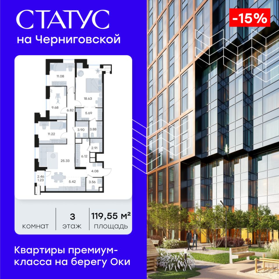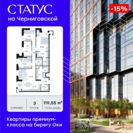 Продается 4-комн. квартира на 3-м этаже в строящемся проекте премиум-класса СТАТУС на Черниговской. Общая площадь лота составляет 119,55 кв. м, из которых 50,61 кв. м отведено под жилую и 5,42 кв. м под кухонную зону. Номер квартиры - 3.