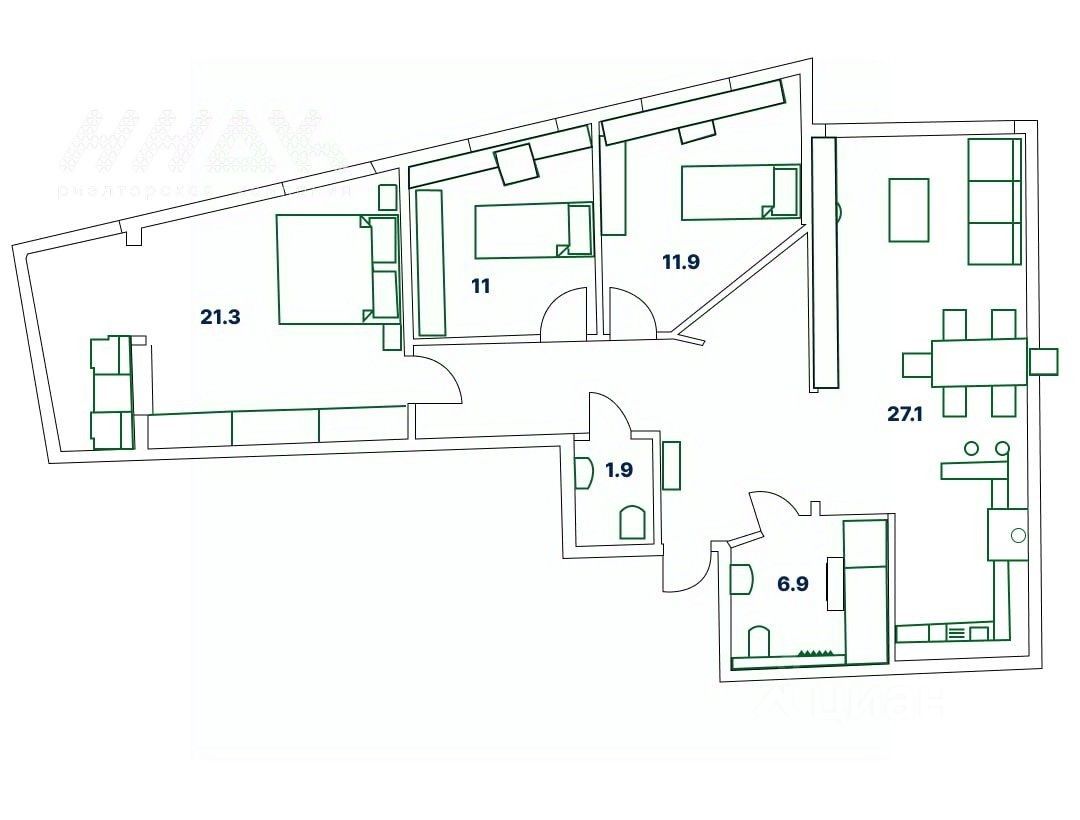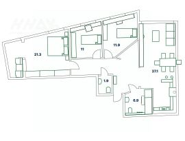 Общая площадь квартиры 91 м² (с коэффициентом лоджий 0,5м2). Эргономичная планировка для большой семьи: три изолированные спальни (21.3 м2, 11.9 м2, 11 м2), просторная кухня-гостиная (27.1 м2), два совмещённых санузла. Из прихожей организована гардеробная для организации хранения вещей. Угловая большая спальная комната с двумя окнами наполнена светом, панорамное остекление и вид на реку и закат. Увеличенный оконные проемы создают ощущение воздуха и комфорта во всей квартире. Из всех комнат завораживающий вид на реку.