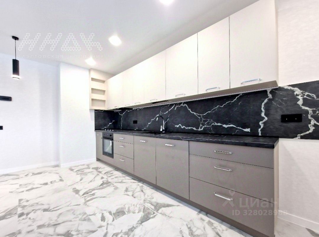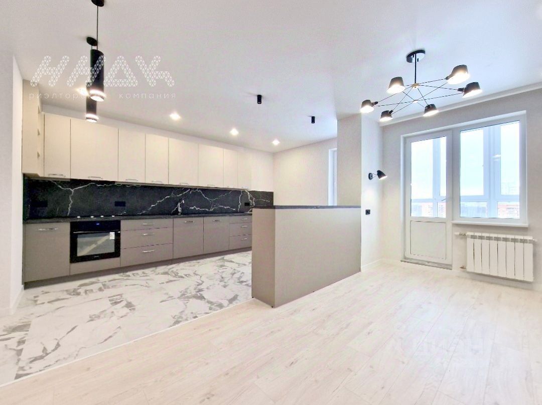 В просторной кухне-гостиной 30 м2 установлен современный кухонный гарнитур с качественной встроенной техникой, барная стойка - разделяющая помещение на рабочую зону и зону гостиной.