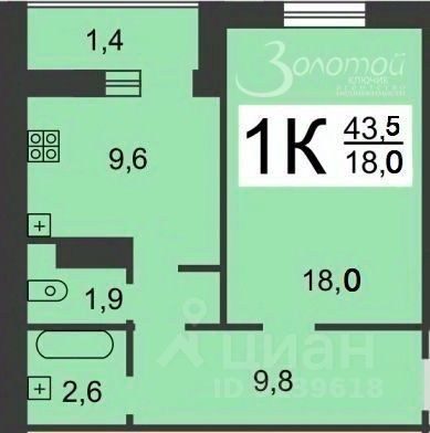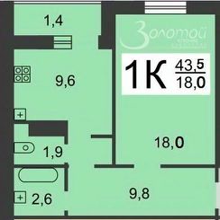 Общая площадь 43,5 кв.м. (с учетом лоджии)