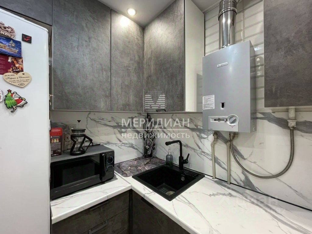 Квартира в хорошем состоянии, сделан ремонт, окна пластиковые, натяжные потолки, ламинат в комнате, на кухне и прихожей линолеум, поменяна проводка и трубы канализационные, новая газовая колонка. Есть балкон (не застеклен). В квартире остается современный кухонный гарнитур, со встроенной бытовой техникой, шкафы в комнате и прихожей, можем оставить кровать.