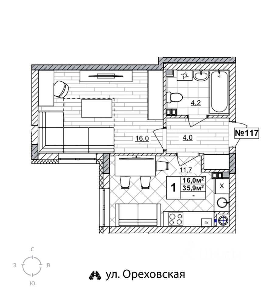 Продаётся 1-комнатная квартира в строящемся доме (дом 2), срок сдачи: II-кв. 2028, общей площадью 35.9 кв.м., на 2 этаже. Жилой комплекс "Смородина" - это комфортный квартал в Автозаводском районе Нижнего Новгорода вблизи улицы Зеленхозовская, который будет состоять из 10-ти четырехэтажных домов.