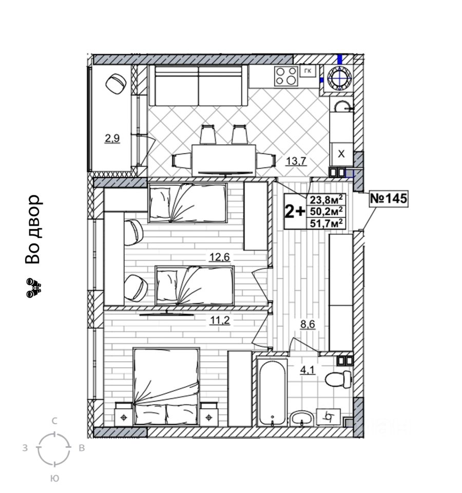 Продаётся 2-комнатная квартира в строящемся доме (дом 2), срок сдачи: II-кв. 2028, общей площадью 51.7 кв.м., на 2 этаже. Жилой комплекс "Смородина" - это комфортный квартал в Автозаводском районе Нижнего Новгорода вблизи улицы Зеленхозовская, который будет состоять из 10-ти четырехэтажных домов.