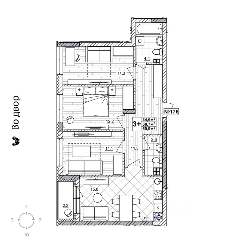 Продаётся 3-комнатная квартира в строящемся доме (дом 2), срок сдачи: II-кв. 2028, общей площадью 69.9 кв.м., на 2 этаже. Жилой комплекс "Смородина" - это комфортный квартал в Автозаводском районе Нижнего Новгорода вблизи улицы Зеленхозовская, который будет состоять из 10-ти четырехэтажных домов.