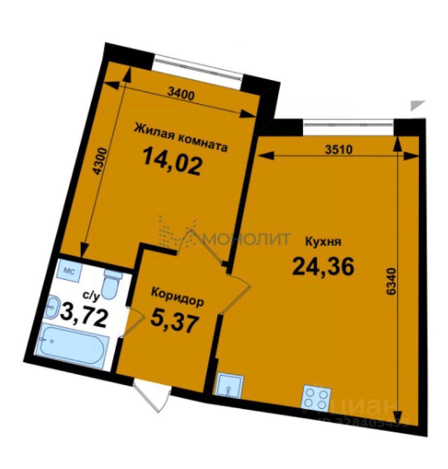 Просторные кухня-гостиная,совмещенный санузел и комната 14.02 м.кв.