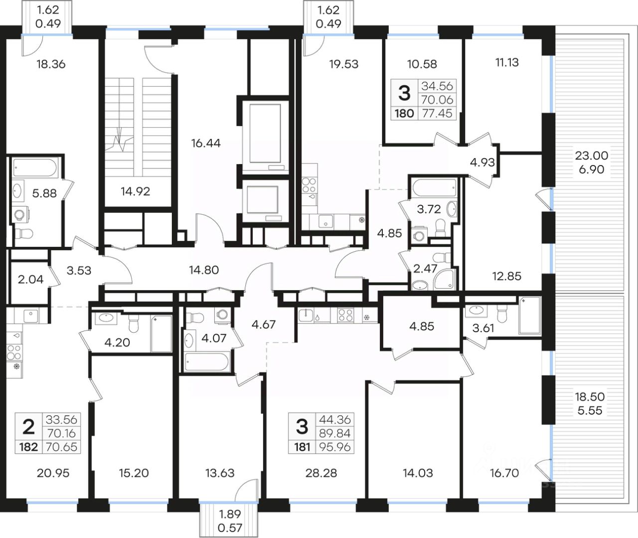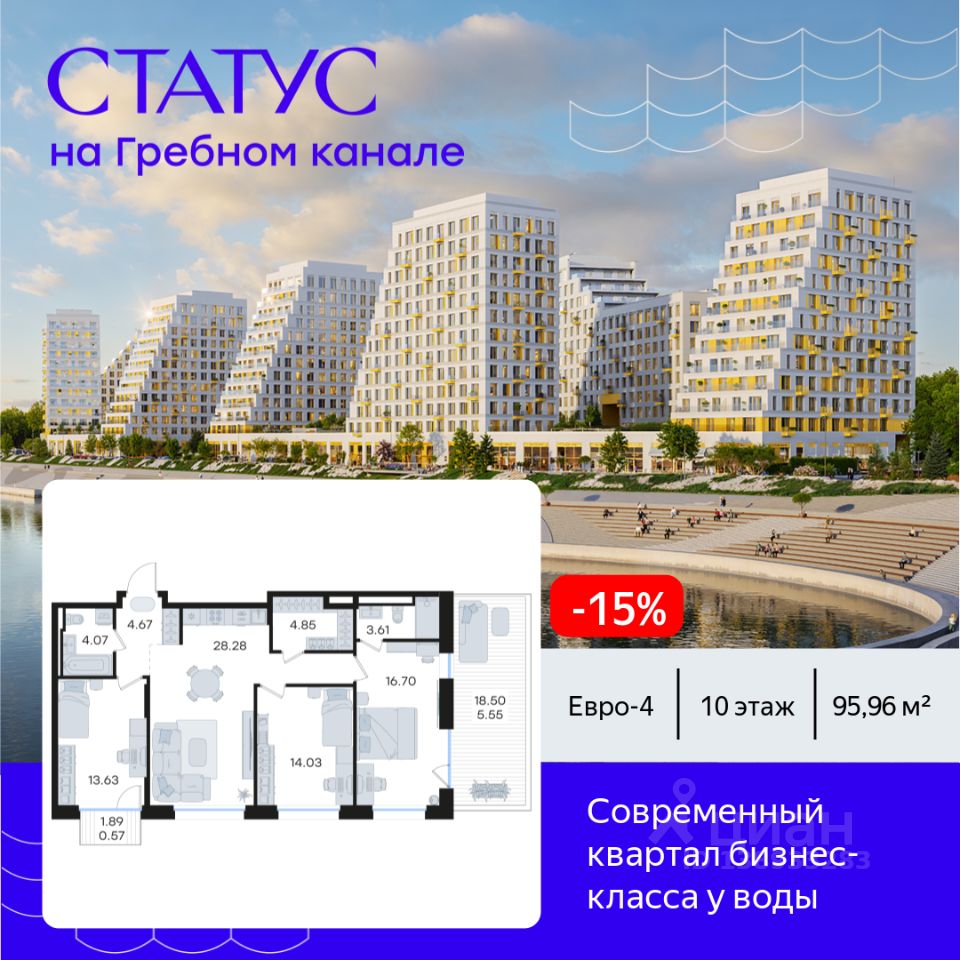 Продается 3-комн. квартира на 10-м этаже в строящемся проекте бизнес-класса СТАТУС на Гребном канале. Общая площадь лота составляет 95,96 кв. м, из которых 44,36 кв. м отведено под жилую и 28,28 кв. м под кухонную зону. Номер квартиры - 181.