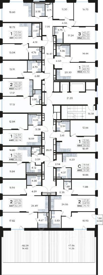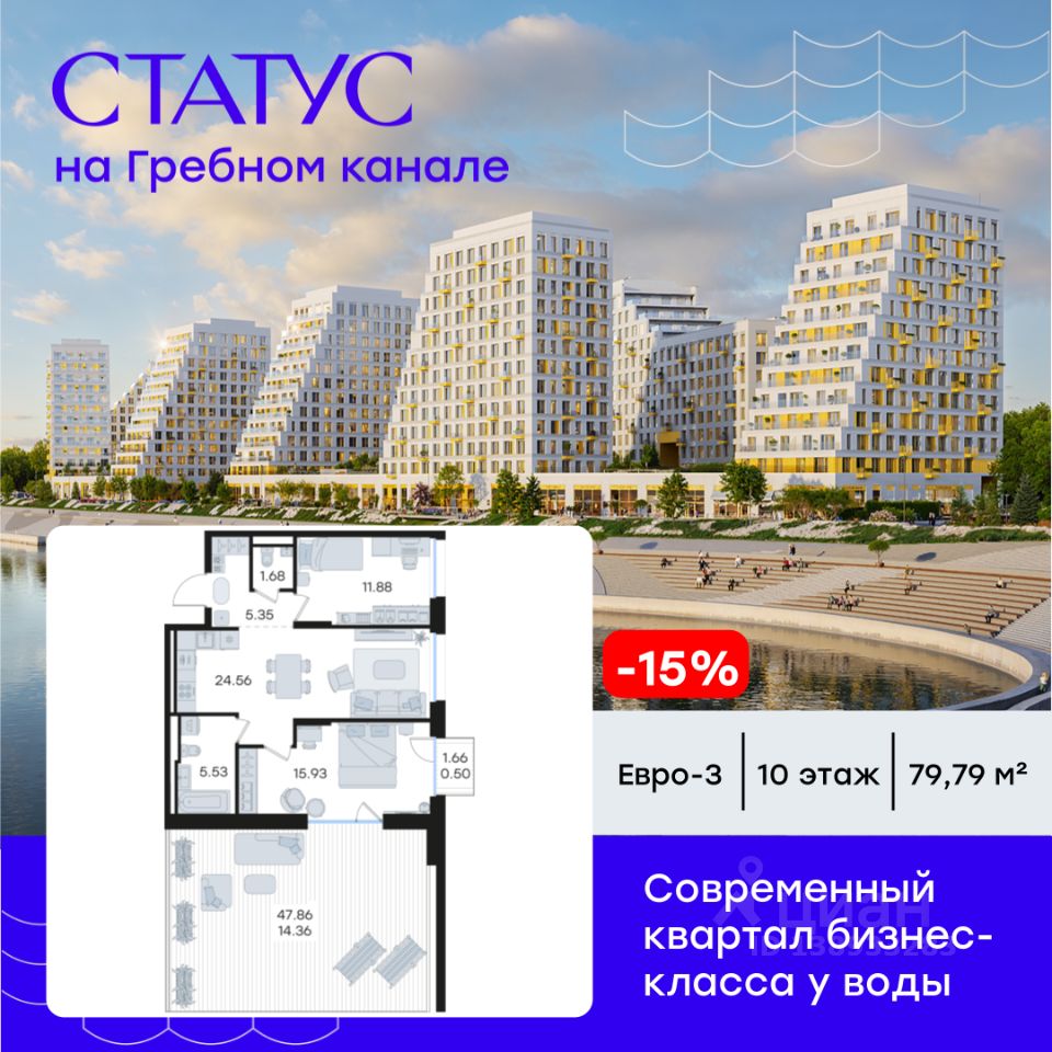 Продается 2-комн. квартира на 10-м этаже в строящемся проекте бизнес-класса СТАТУС на Гребном канале. Общая площадь лота составляет 79,79 кв. м, из которых 27,81 кв. м отведено под жилую и 24,56 кв. м под кухонную зону. Номер квартиры - 446.
