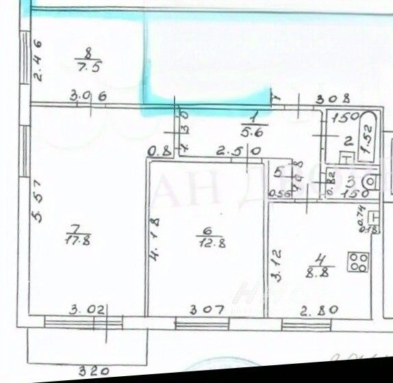 Общая площадь квартиры без учёта балкона 56,4 кв. м., жилая площадь 38,1 кв.м.: 2 уютные изолированные комнаты правильной формы 12,8 и 7,5 кв.м. и смежная гостиная 17,8 кв.м., функциональная кухня 8,8 кв.м. раздельный санузел, просторная прихожая 5,6 кв.м.