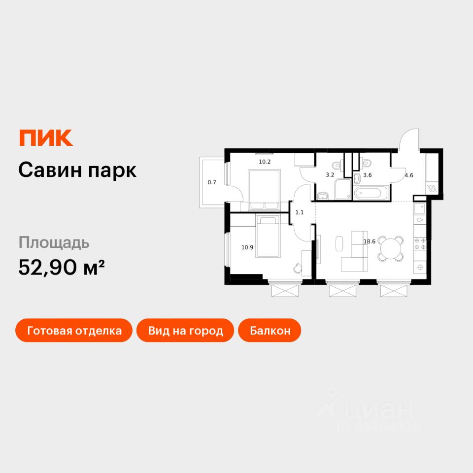 Продаётся 2-комн. квартира площадью 52,9 кв.м на 2 этаже 25 этажного дома (Корпус 10, Секция 1) проекта ПИК Савин парк. Светлый просторный подъезд на уровне земли, функциональная планировка, большие окна, c отделкой.