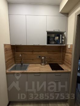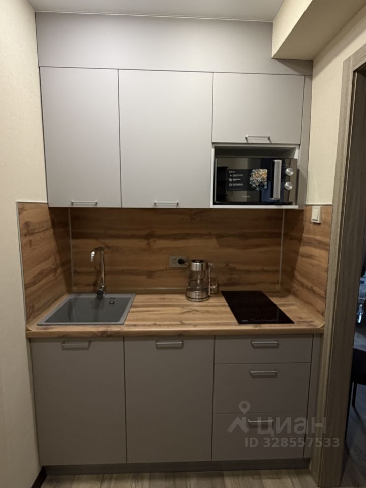 Кухня расположена во входной зоне в компактной нише. Несмотря на небольшой размер, она удобная и функциональная, оснащена новым кухонным гарнитуром и всей необходимой техникой.