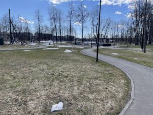 Большой благоустроенный сквер с:* Детской площадкой для разного возраста* Спортивными тренажерами* Зонами для активных игр (мяч, хоккей, теннис)* Лавочками и зелеными насаждениями
