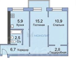 • Общая площадь 44 м², кухня 5.9 м², просторная гостиная 15.2 м², спальная комната 10.9 м²; гардеробная 2.8 м², с/у совмещенный. Квартира укомплектована и готова принять жильцов.