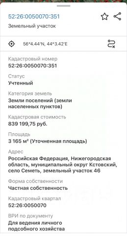 Арт. 65291983 Продаётся земельный участок 31,65 сот. по адресу: Нижегородская обл., Кстовский район, село Семеть. Категория земель-земли населенных пунктов (для ведения личного подсобного хозяйства). Кадастровый номер 52:26:0050070:351. Электричество по границе участка (15 кВТ), подключено и оплачено. Участок угловой.