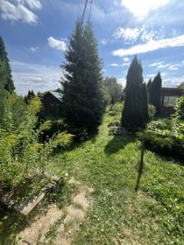 Ровный участок, засажен туями, кустарниками и цветами.
