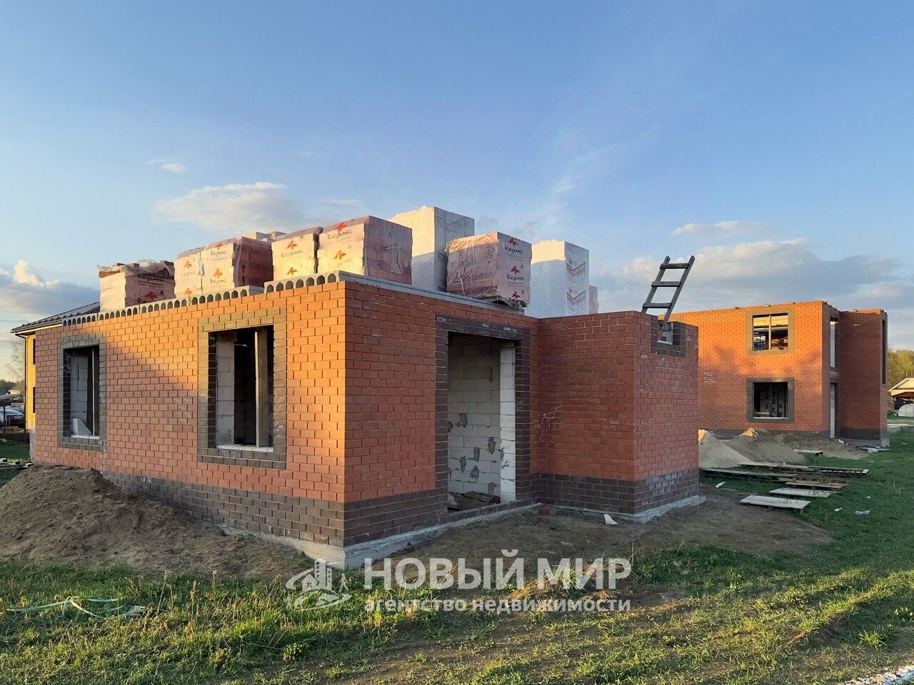 Построен из газосиликатных блоков (400 мм), с облицовкой кирпичом.