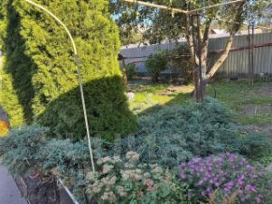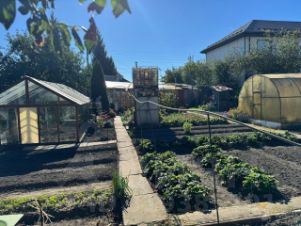 На участке растут яблони, жимолость, виноград, малина, Виктория. Теплица.