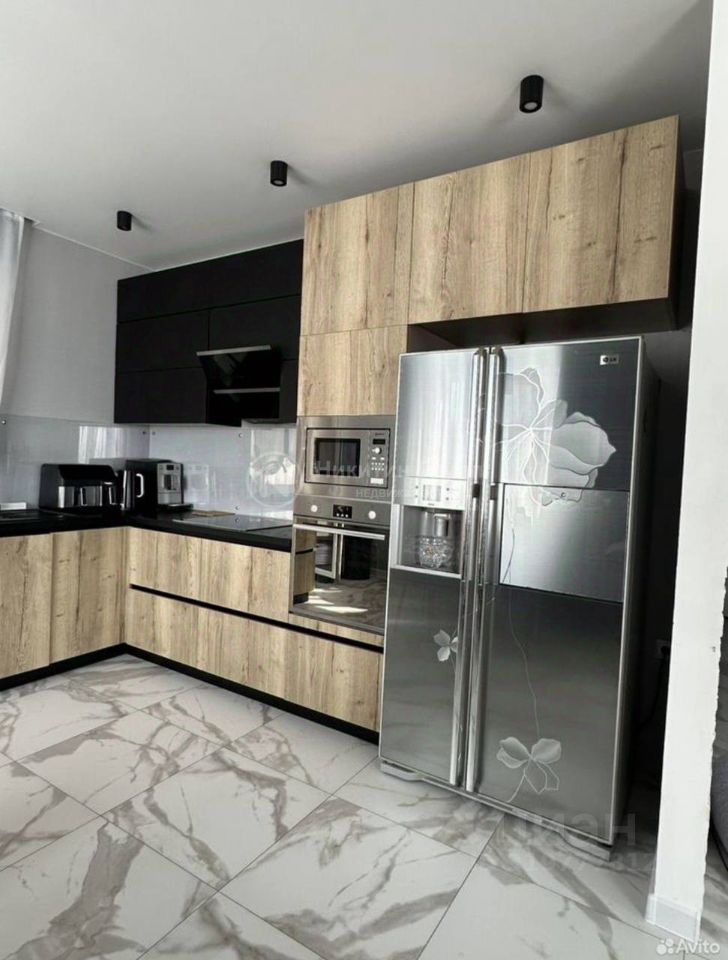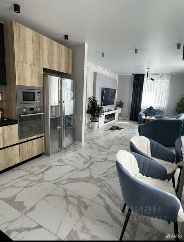 Кухня-гостиная (36,4 кв. м) с встроенной кухней и современной бытовой техникой, создающая функциональное и эргономичное пространство для приготовления пищи и приема гостей.