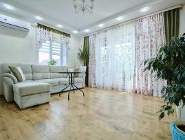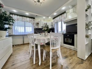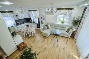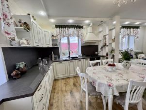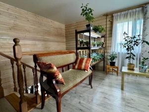 В доме сделан хороший ремонт. На первом этаже расположена: кухня-гостиная, с выходом на терассу и земельный участок (15 соток), санузел, просторный холл, спальня.