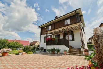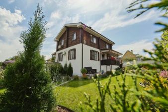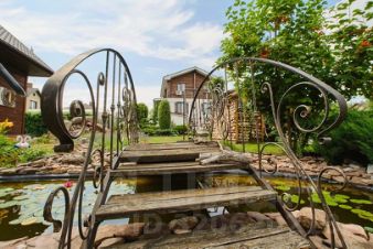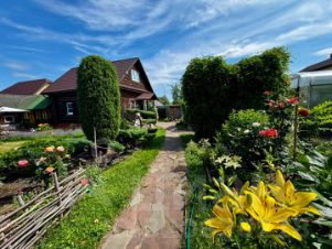 Территория дома огорожена. Полностью ухожена, продумана до мелочей (привлекался ландшафтный дизайнер). Территория оборудована зоной для отдыха для гостей, банным комплексом, садом. На территории полностью обустроенный гостевой дом, оформлен (2014 года постройки)