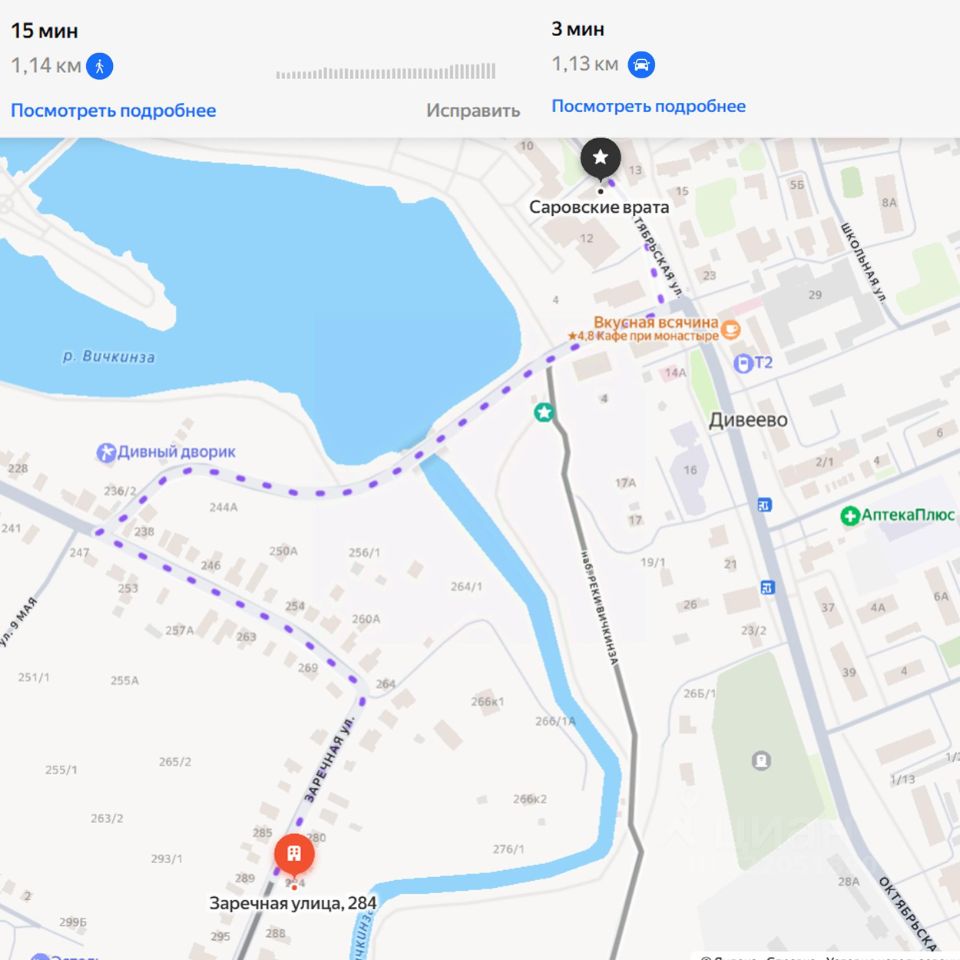 Участок 13,5 соток расположен в селе Дивеево, на улице Заречной, в пешей доступности от Серафимо-Дивеевского монастыря — около 1,4 км.