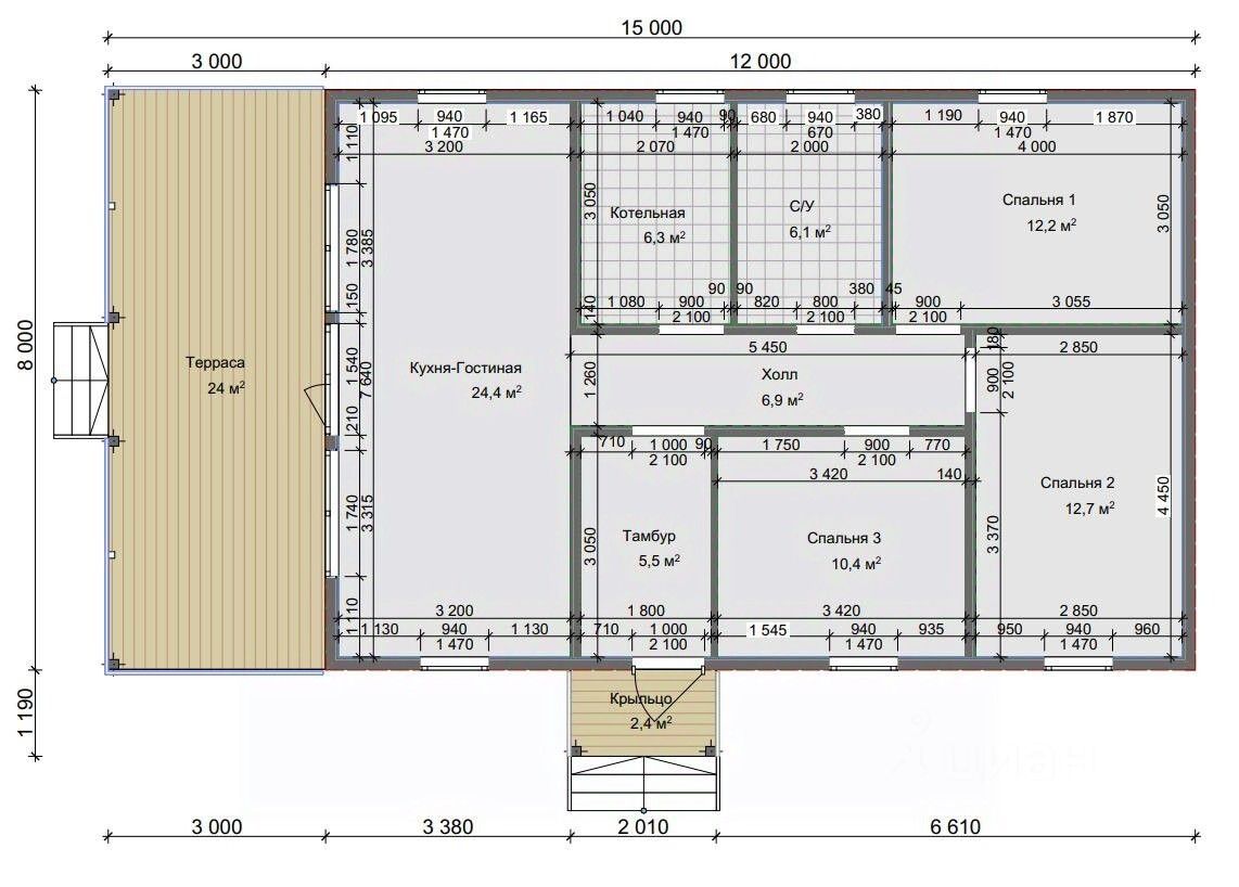 Три отдельные комнаты (10,4 м², 12,7 м², 12,2 м²) — личное пространство для каждого члена семьи.