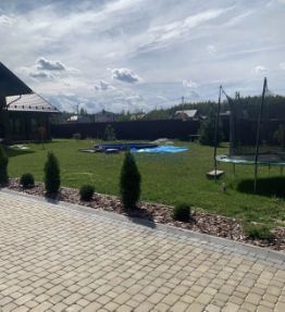 Дом выполнен из бревна. Сделана отделка. Все коммуникации в доме.Для отдыха в доме есть баня, на улице бассейн. Участок правильной прямоугольной формы,ухоженный, с прекрасным газоном, грамотно размещенными декоративными растениями и детской площадкой.