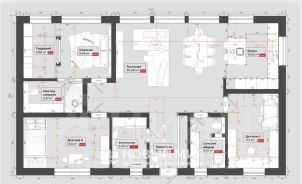 3 отдельные комнаты: 11,5 кв.м.+ 13,3 кв.м. + 9,0 кв.м. - мастер-спальня со своей гардеробной (5,68 кв.м.) и санузлом (5,21 кв.м.), редкое преимущество для 1-этажного дома;