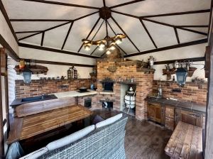 -просторная кухня полностью оборудованная мебелью и техникой с выходом на веранду и сад;
