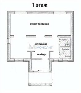 1 этаж - просторная кухня-гостиная с вариантами планировки, большой холл, санузел, котельная, тамбур, крыльцо.