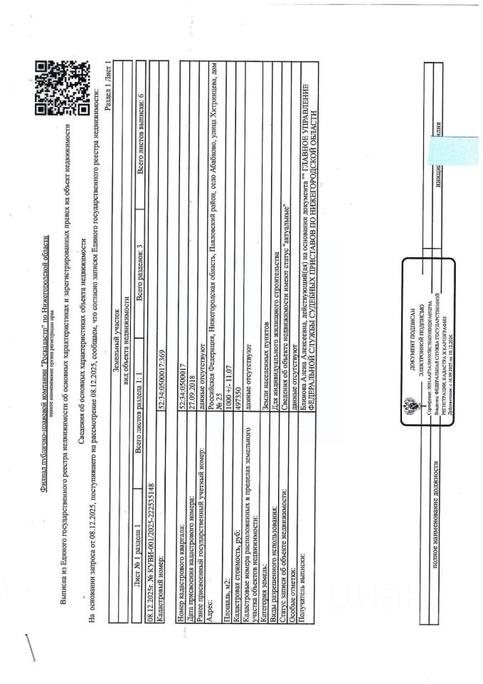 Повторые торги. Земельный участок площадью 1000 +/- 11, 07 кв. м, кадастровый 52:34:0500017:369, категория земель - земли населенных пунктов, вид разрешенного использования - для индивидуального жилищного строительства. Местоположение: Нижегородская обл. , Павловский р-н, с. Абабково, ул. Хитринцева, д. 25