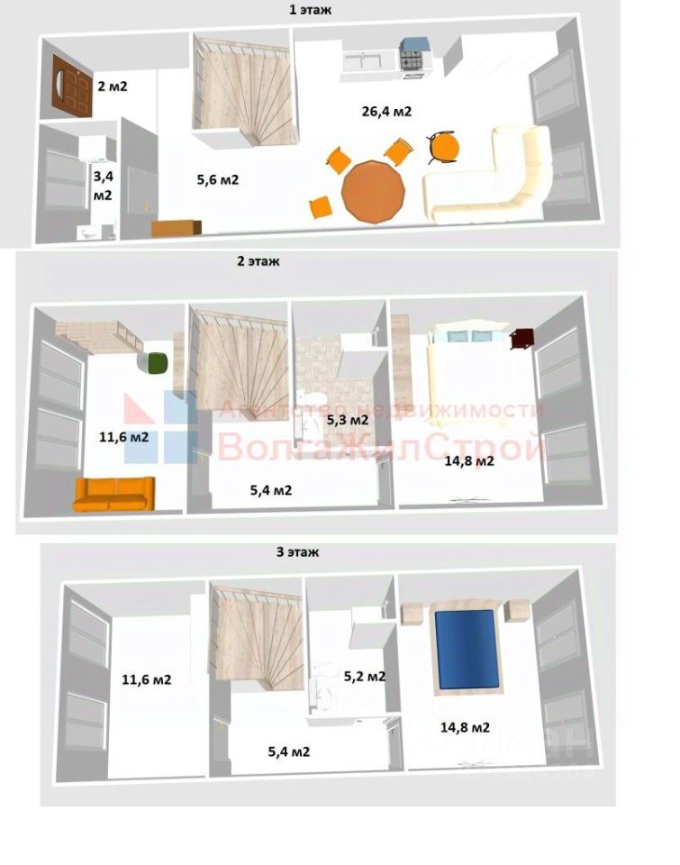 санузлов: 3 (на каждом этаже);