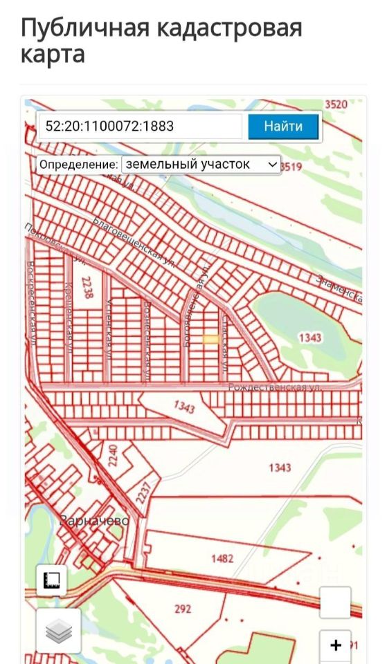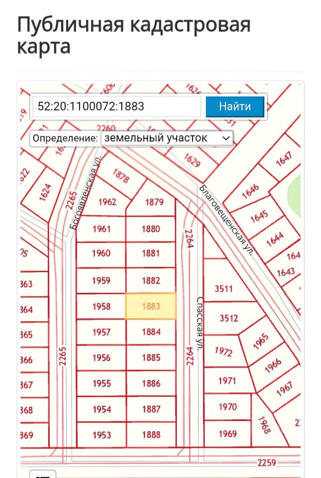 Кадастровый номер участка 52:20:1100072:1883.