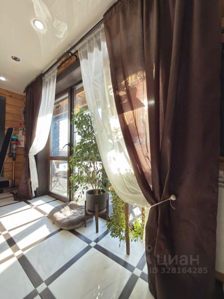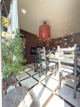 кухня-гостиная площадью 42,8 м с витражными окнами и выходом на веранду