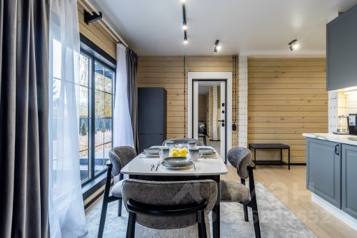 и большой зал совмещенный с кухней, большой стол со стульями, диван, барная стойка, кресло.