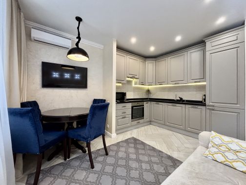 До 5-х спальных мест двуспальная кровать, угловой диван и есть возможность дополнительного односпального места. На кухне плита, СВЧ-печь, электрочайник и холодильник. В квартире есть: Wi-Fi, ТВ, стиральная машина, сушилка, гладильная доска и утюг