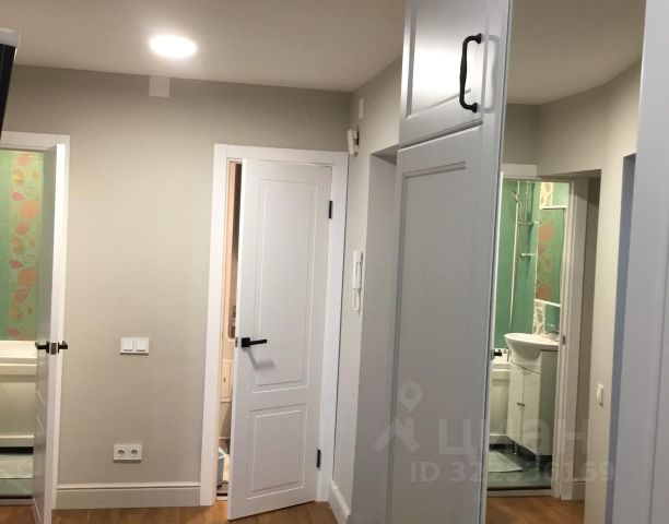 В прихожей большое зеркало, вместительный комод, мягкий диван-лавка, есть оборудование для сигнализации, домофон через приложение, интернет, телевидение.