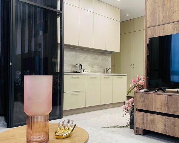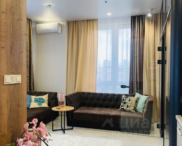Дизайнерский ремонт, апартаменты укомплектованы всем необходимым для комфортного проживания, вся мебель сделана на заказ, огромное количество шкафов и полок, светильников и ламп, неоновая подсветка в спальне и на кухне, белый мраморный пол, квартира изначально была студией, но выполненная на заказ стеклянная стена-перегородка отделила спальню от гостиной, которая в свою очередь плавно переходит в кухню, при этом другая перегородка отделяет гостиную от кухни.